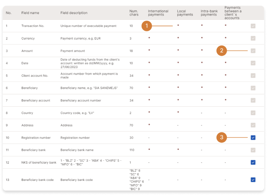 ➁ - If a specific field is optional for the payment type (there is no asterisk next to the field in the respective column), but the last column is marked with a gray checkmark that cannot be removed, then the specified field should be present in the imported file, but the field value can be empty.