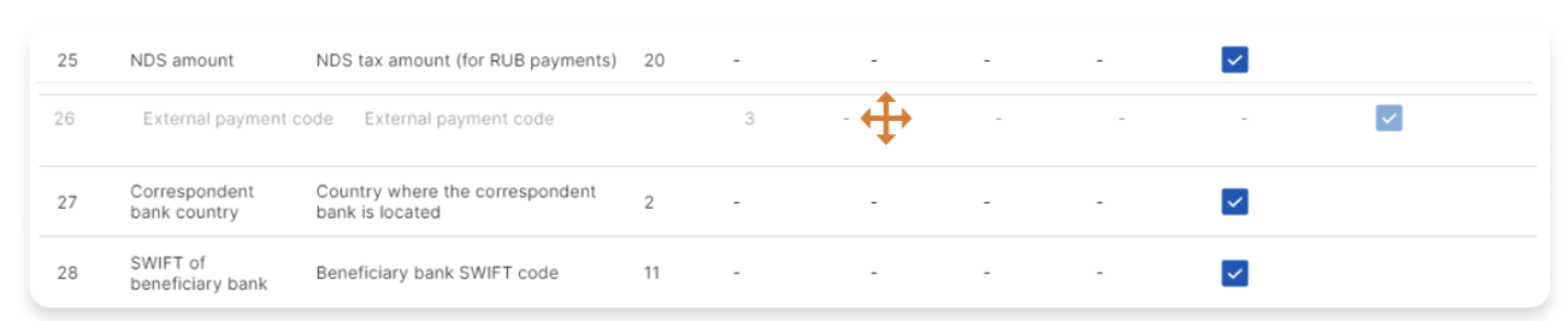 To indicate the position number of each payment instruction field in the import file row, click on the field and move it using the mouse to the desired position.