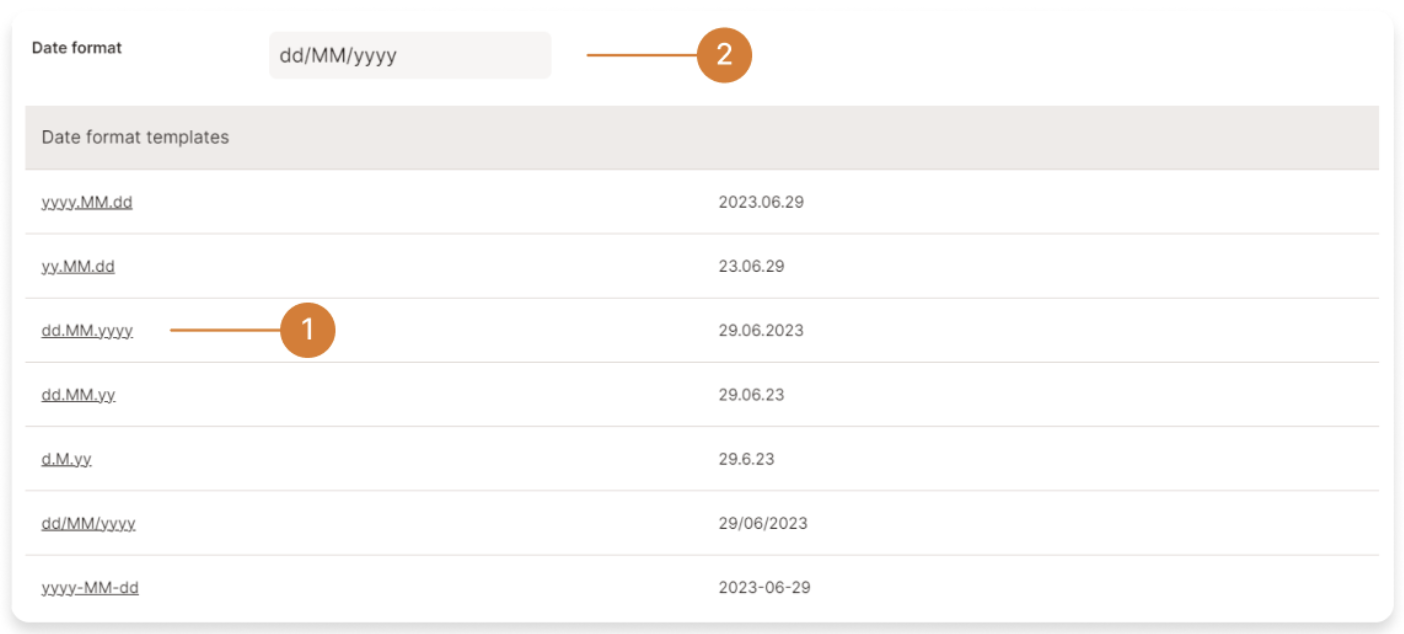 ➀ - In the section, several date format templates are available, which can be selected by clicking on the corresponding template.
