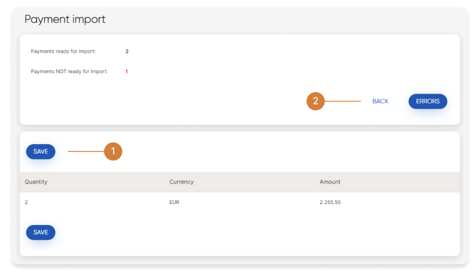 ➀ - You can perform a partial import of the file by clicking the "Save" button. Successfully processed payments will be imported into the internet banking system, and you can view them with the status "New" in the "Customer Transactions/For Signature" menu.