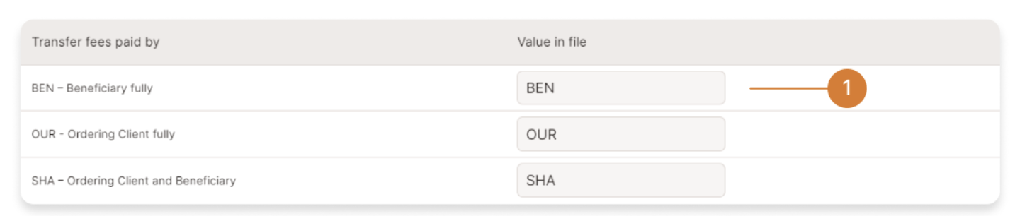 ➀ - In the "Payer of Commission" section, the payment codes for commissions are specified, which can be changed in the corresponding fields in the "Value in File" column.