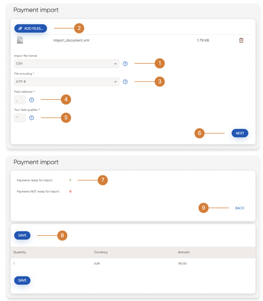➃ - By default, the comma (",") is set as the field delimiter, which separates the payment fields in the file. You can change this value.