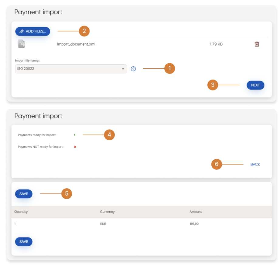 ➀ - In the payment import screen, select "ISO 20022" as the "Import File Format" value.