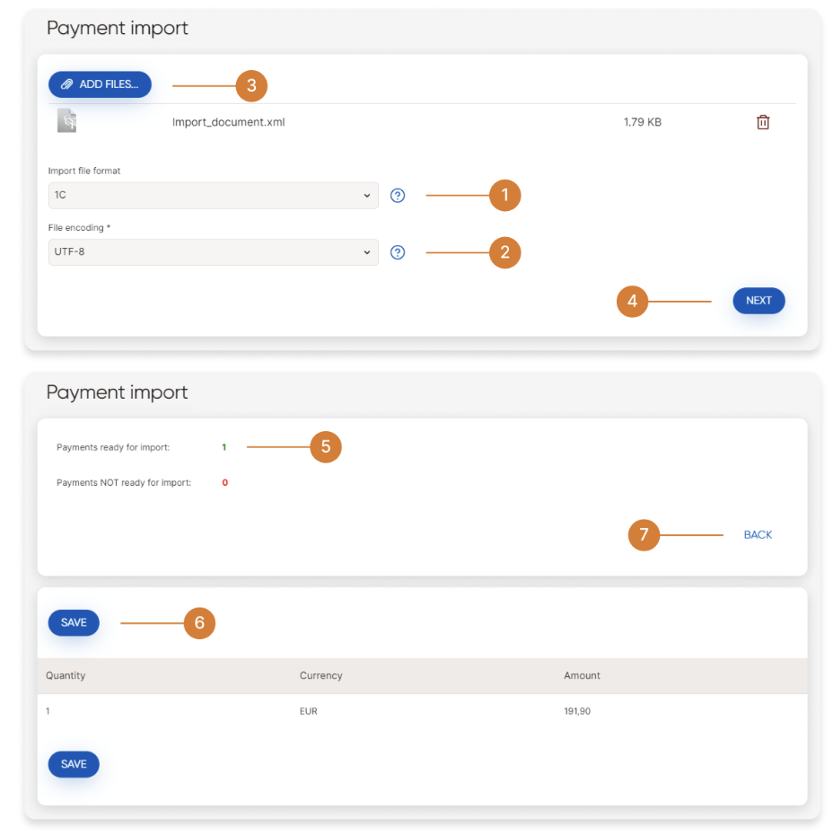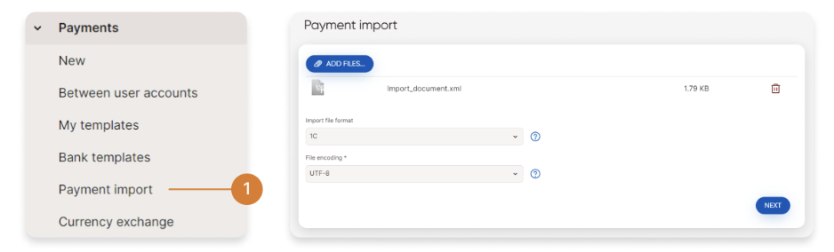 ➀ - In the payment import screen, select "1C" as the "Import File Format" value.