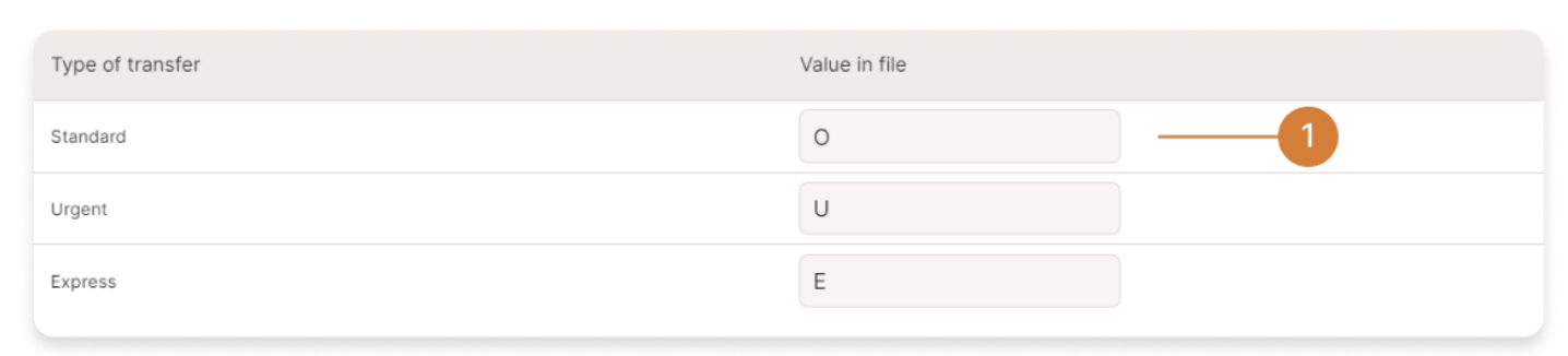 ➀ - In the "Enumeration Type" section, the urgency of the payment is specified, which can be changed in the corresponding fields in the "Value in File" column if the urgency values in the import file differ from the default values: Standard - "O"; Urgent - "U"; Express - "E".