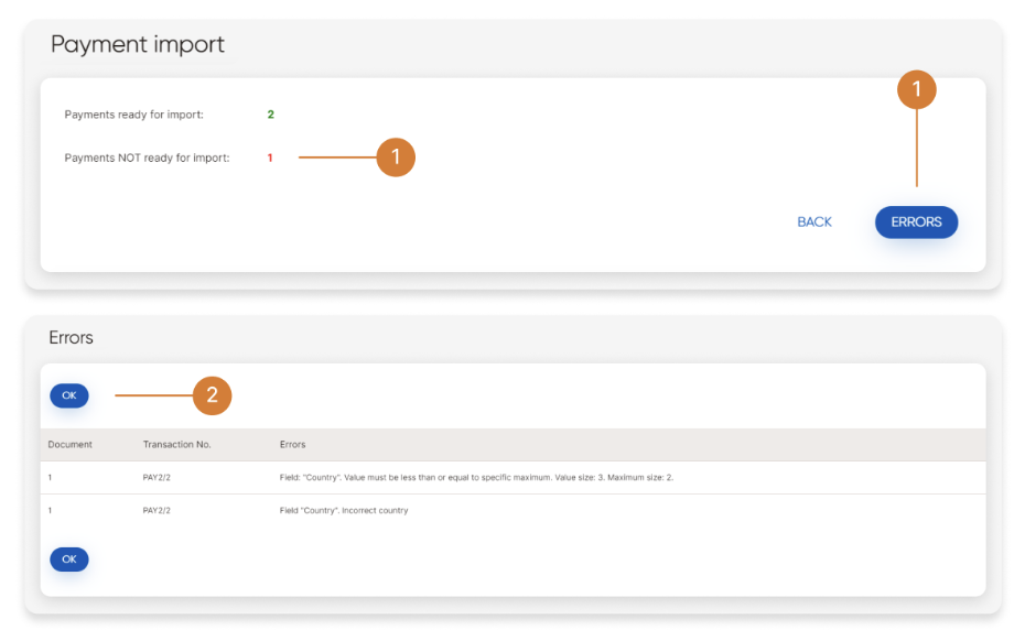 ➀ - If a payment cannot be imported, by clicking on the "Errors" button, you can view a list of errors detected in the payment.
