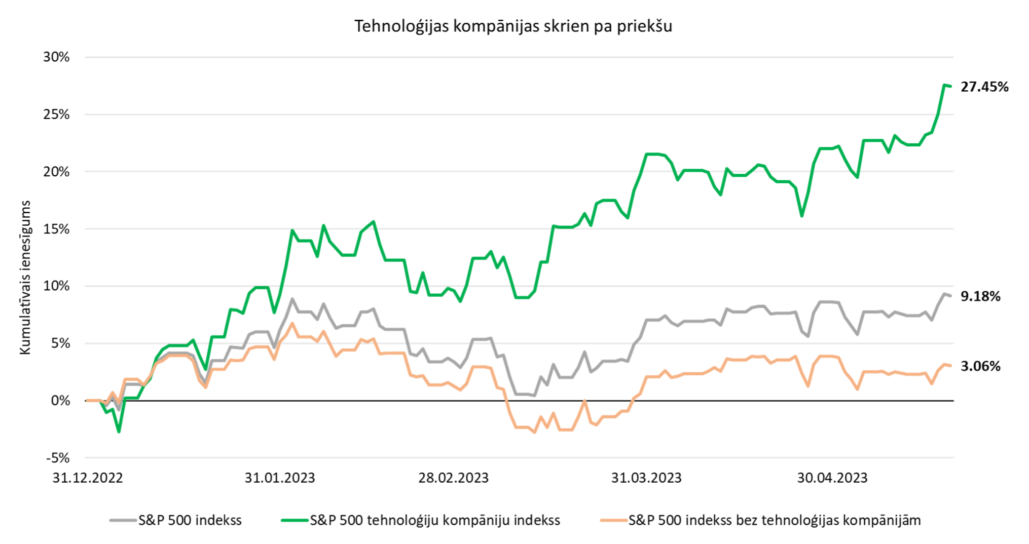 Neraugoties uz notiekošo cīņu ar pastāvīgi augsto inflāciju, augstajām procentu likmēm, banku bankrotiem, iespējamo ASV recesiju un parāda griestu krīzi, S&P 500 tehnoloģiju indekss, kas mēra ASV lielāko tehnoloģiju uzņēmumu sniegumu, šogad ir palielinājies par aptuveni 27%, kamēr viss S&P 500 indekss ir uzaudzis tikai par 9%. Turklāt, ja no kopējā indeksa izslēdzam tehnoloģiju akcijas, sniegums vēl vairāk samazinās - līdz tikai 3%. Starpība ir ļoti ievērojama!