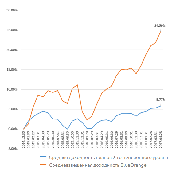Для сравнения мы взяли среднюю доходность планов 2-го пенсионного уровня с начала 2015 года до 28 апреля 2017 года. Цели и названия конкретных планов указывать не станем.