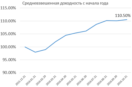 Октябрь прошел на фоне выборов президента США. Котировки акций стояли на месте или слегка снижались, и сейчас наблюдается растущая разница в доходности отдельных секторов. Однако, несмотря на воцарившуюся неопределенность, мы смогли заработать 0,43% для своих клиентов, что довело средневзвешенную доходность с начала года до 10,5% после уплаты комиссий.